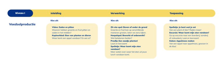De lessen zijn er op twee niveaus: voor leerlingen met uitstroomprofiel dagbesteding (niveau I) en op uitstroomprofielen (beschut) werk en praktijkonderwijs (niveau II). Niveau I is eenvoudig en visueel, niveau II biedt meer verdieping. Jij kiest wat past bij jouw groep.