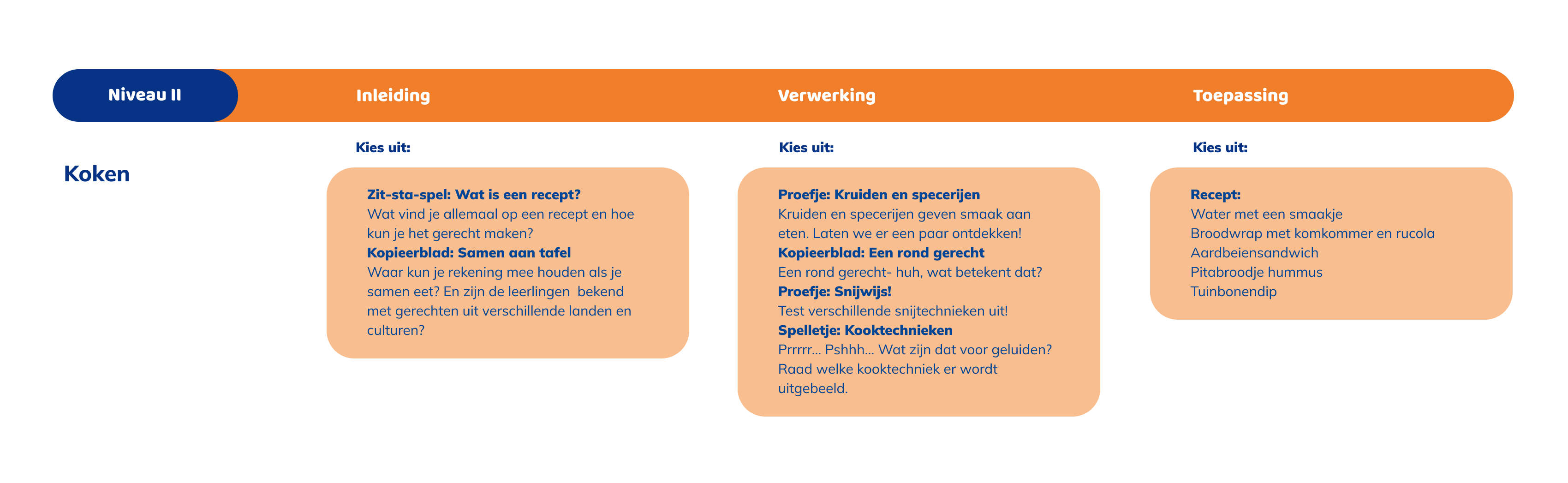 Voor het gespecialiseerd onderwijs zijn er samen met experts uit het gespecialiseerd onderwijs aangepaste Smaaklessen ontwikkeld die aansluiten bij de belevingswereld, het tempo én de mogelijkheden van deze leerlingen. Op deze pagina vind je het overzicht voor niveau II - Koken.