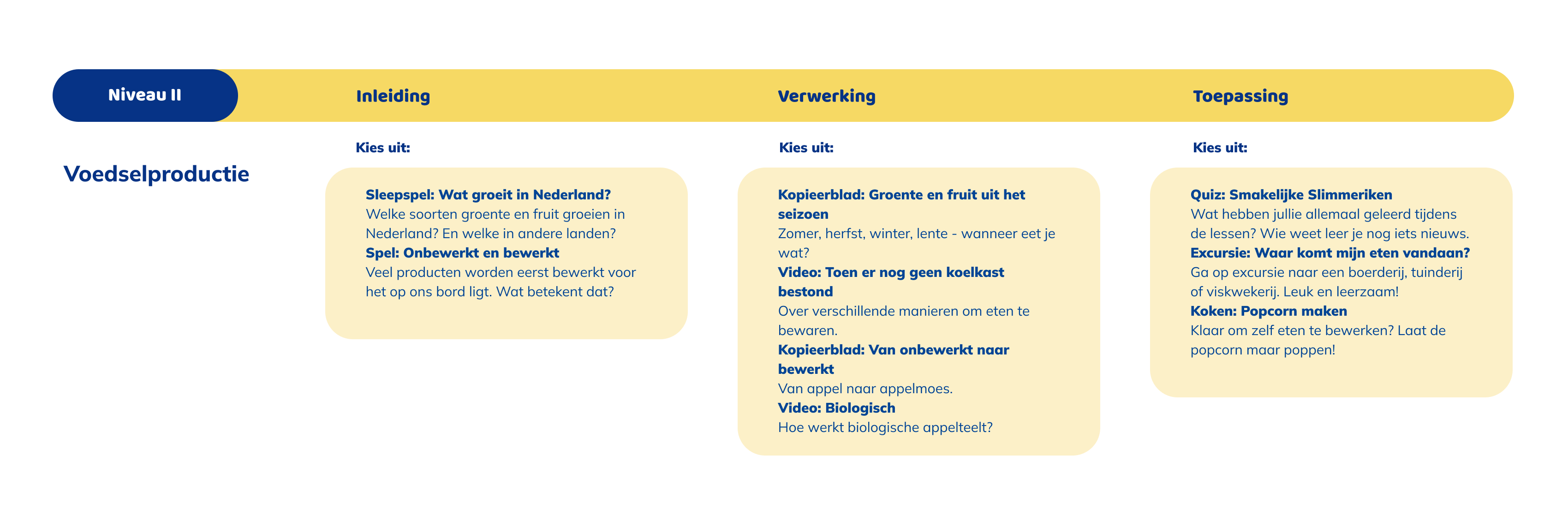 De lessen zijn er op twee niveaus: voor leerlingen met uitstroomprofiel dagbesteding (niveau I) en voor leerlingen met uitstroomprofiel (beschut) werk of praktijkonderwijs (niveau II). Niveau I is eenvoudig en visueel, niveau II biedt meer verdieping. Jij kiest wat past bij jouw groep.
