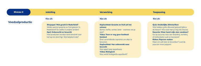De lessen zijn er op twee niveaus: voor leerlingen met uitstroomprofiel dagbesteding (niveau I) en op uitstroomprofielen (beschut) werk en praktijkonderwijs (niveau II). Niveau I is eenvoudig en visueel, niveau II biedt meer verdieping. Jij kiest wat past bij jouw groep.