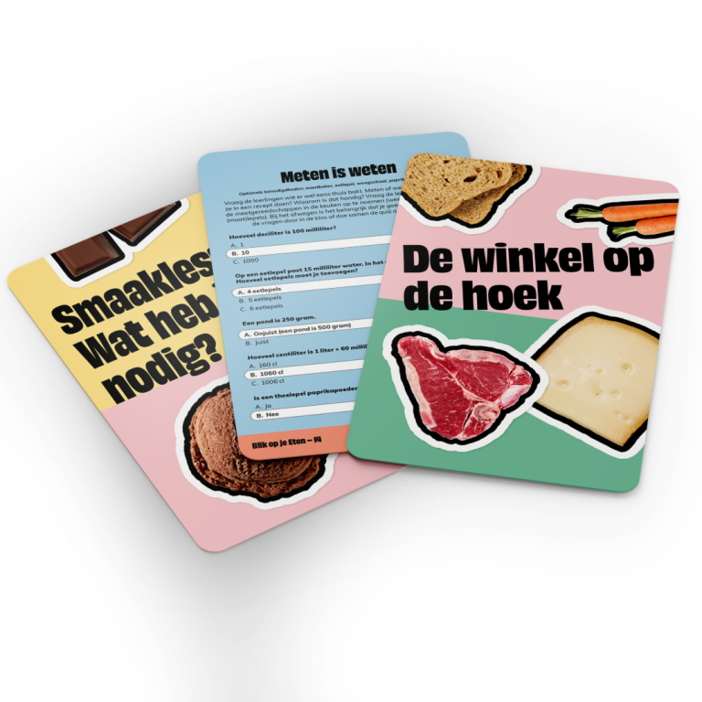 Blik op je Eten bestaat uit activiteitenkaarten voor in de klas of op het schoolplein. De activiteiten gaan allemaal over eten en kunnen goed worden ingezet voor of na een eetmoment. Hoe smaakt het? Is het gezond? Waar komt het vandaan? Hoe komt het op mijn bord en hoe is het bereid?