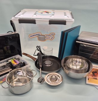 In de Kookleskist zitten verschillende keukenmaterialen, een handleiding over de Kookleskist, een receptenboek, een overzichtsblad met de inhoud van de Kookleskist en een inpakinstructie. De materialen zijn zorgvuldig uitgekozen en getest samen met leerkrachten, kinderen en pabostudenten.